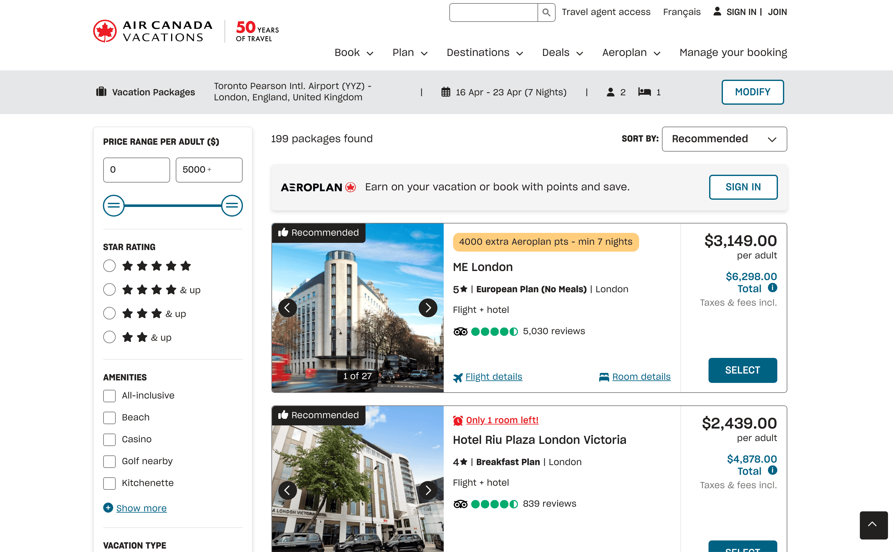 - Go to the destination page, for example: Air Canada Hotel Search Result.