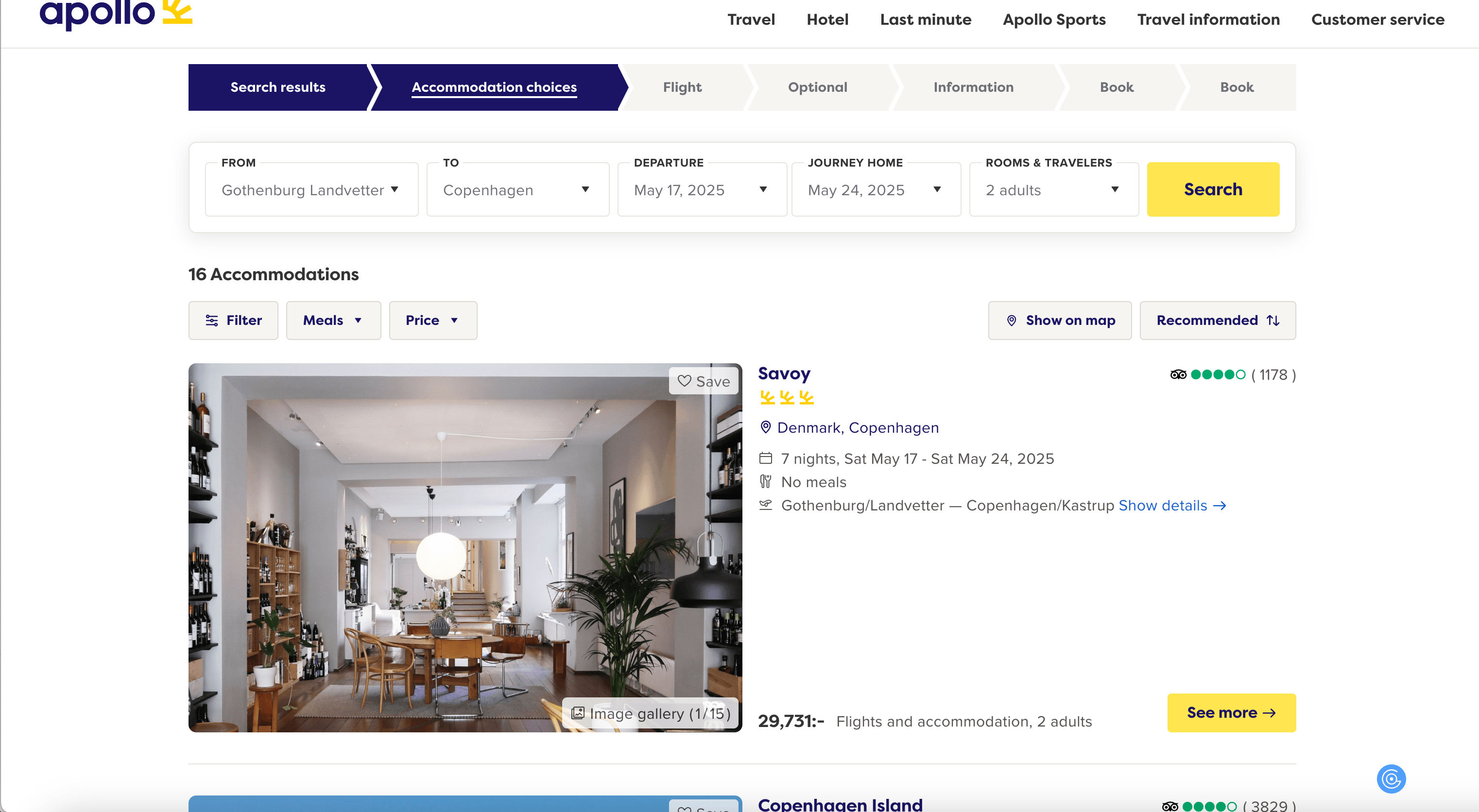 - Go to the Apollo.se Accommodations Search Result Page.