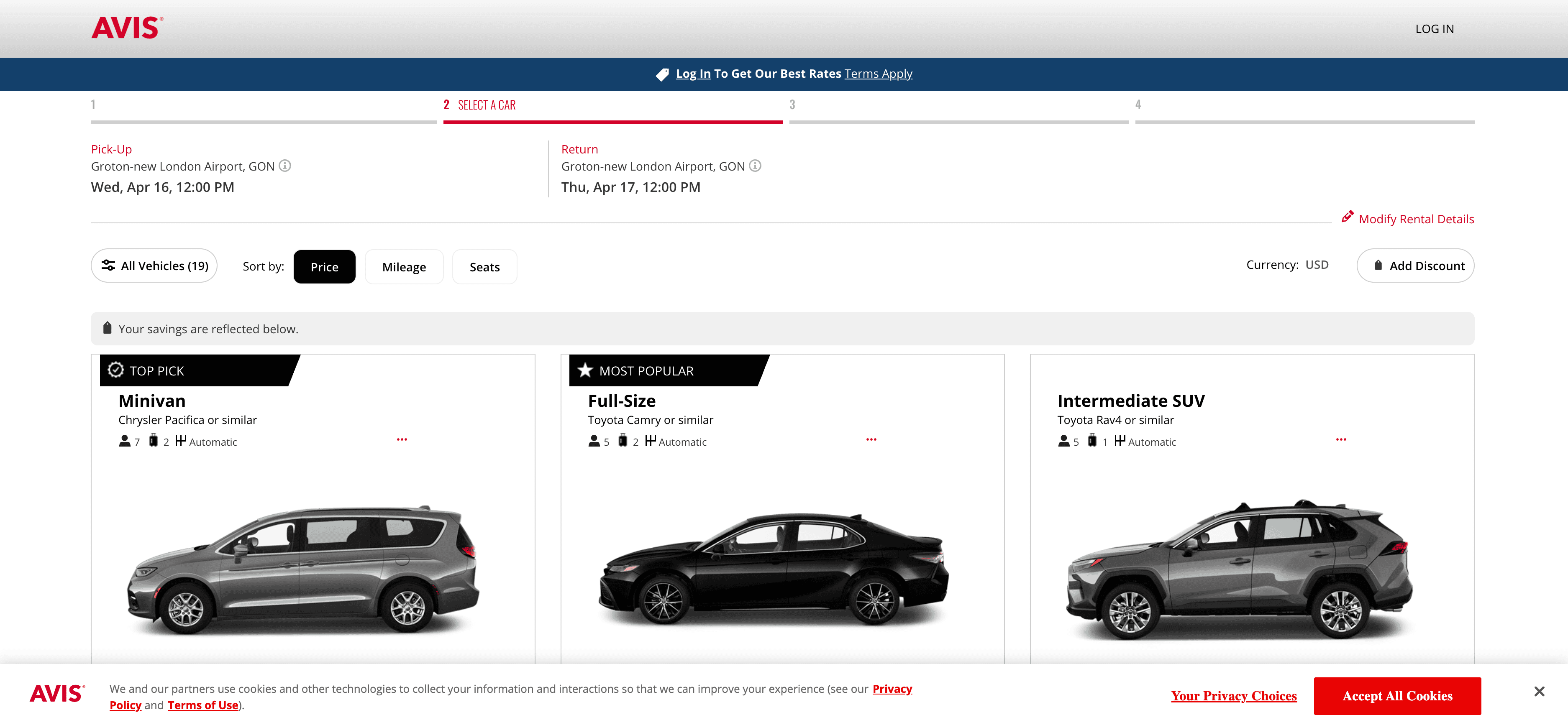 - Go to the destination page, for example: Avis Car Rental Vehicle Selection Page.