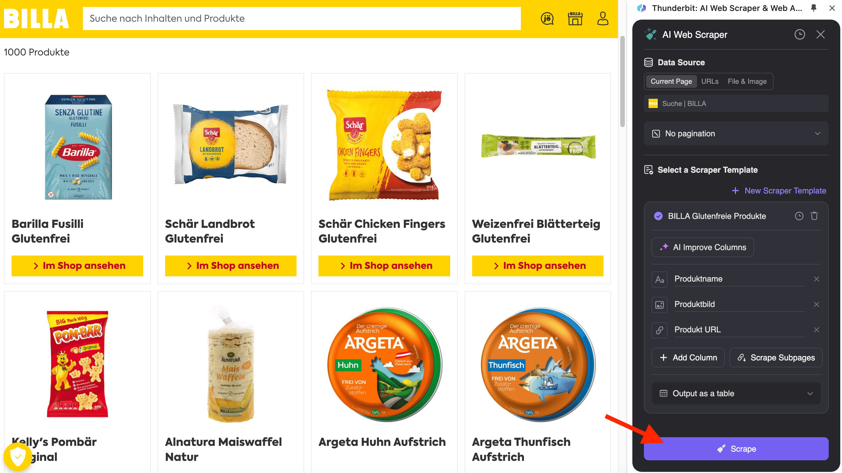 The BILLA Scraper allows you to extract product details from listing pages, such as this gluten-free product search page. This is perfect for gathering data on multiple products at once.