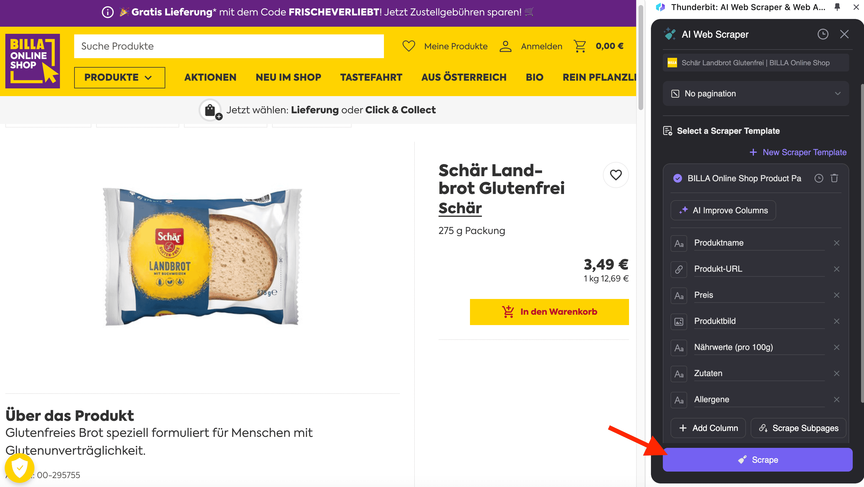 The BILLA Scraper also supports scraping individual product pages, such as this SKU page for gluten-free bread. This is ideal for collecting detailed information about a specific product.
