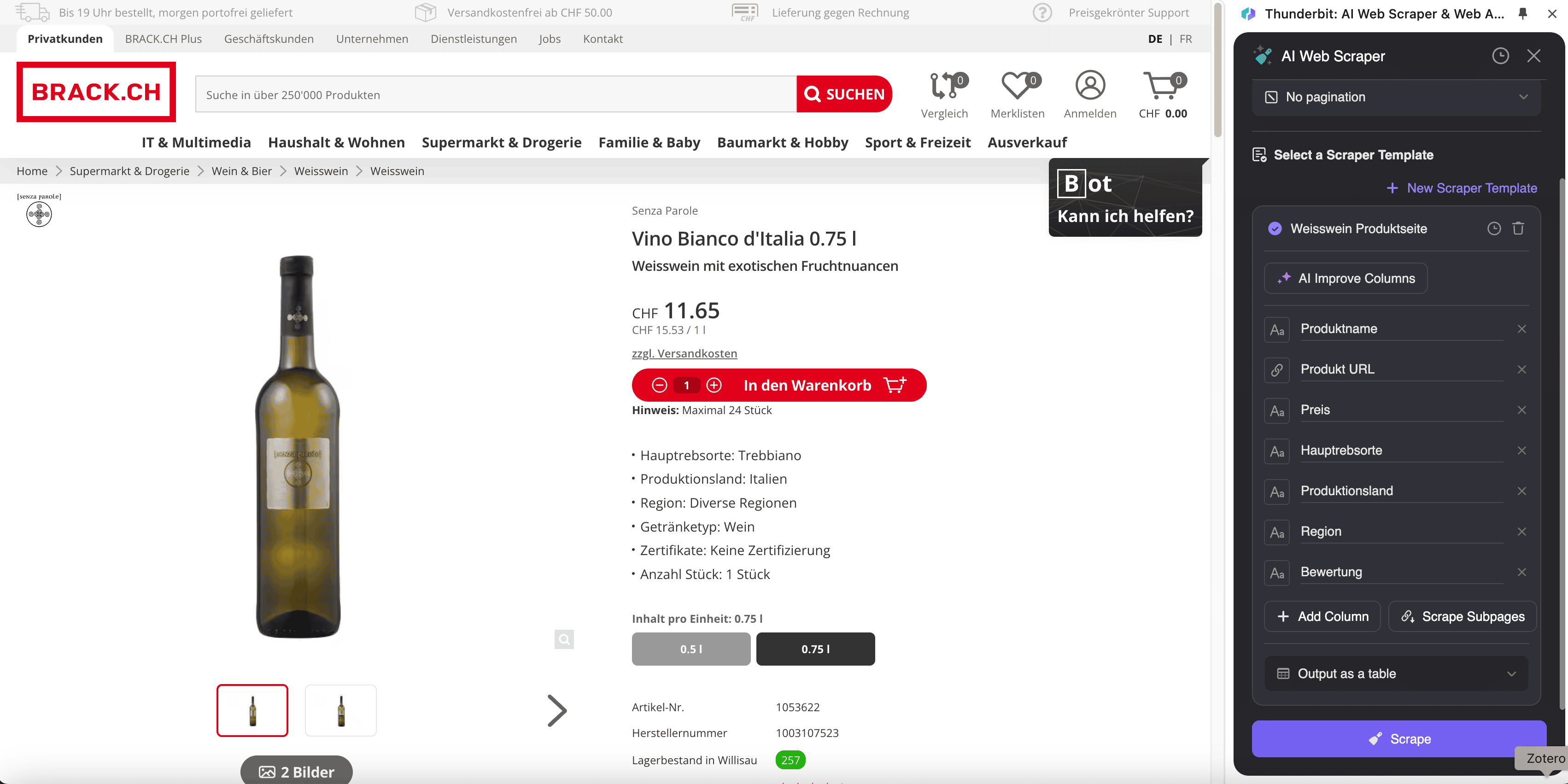 The Scrapebit Brack Scraper enables you to extract structured data from Brack's product listings and SKU pages. Use AI-powered field suggestions to quickly gather product names, prices, images, grape varieties, and regions for analysis or research. Ideal for e-commerce professionals, marketers, and researchers seeking Brack product data.