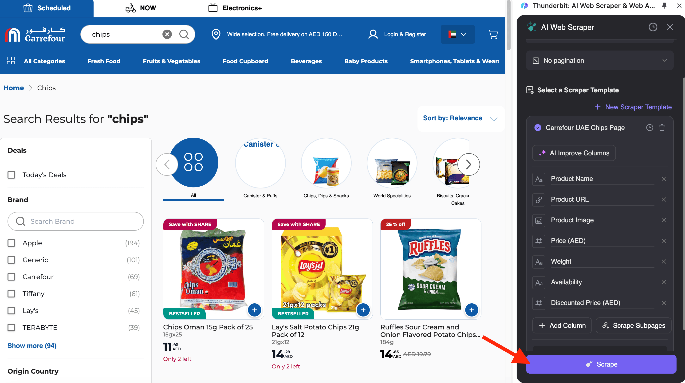 The Carrefour UAE Scraper allows you to extract product details from listing pages, such as this chips search result page. This is ideal for tracking product availability, prices, and descriptions.