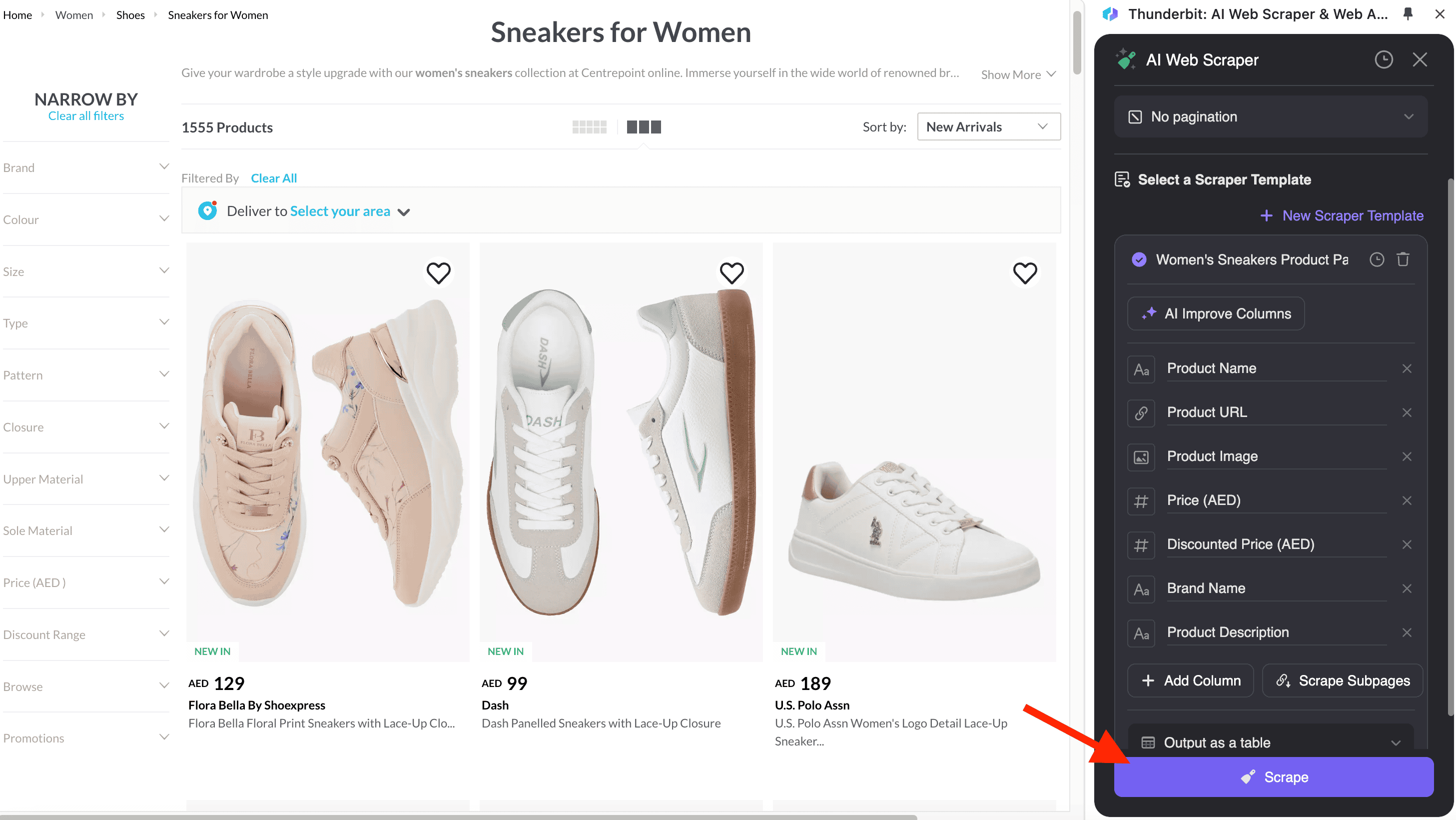 The Centrepoint Scraper allows you to extract detailed information from the Women's Sneakers Listing Page, including product names, prices, and reviews.
