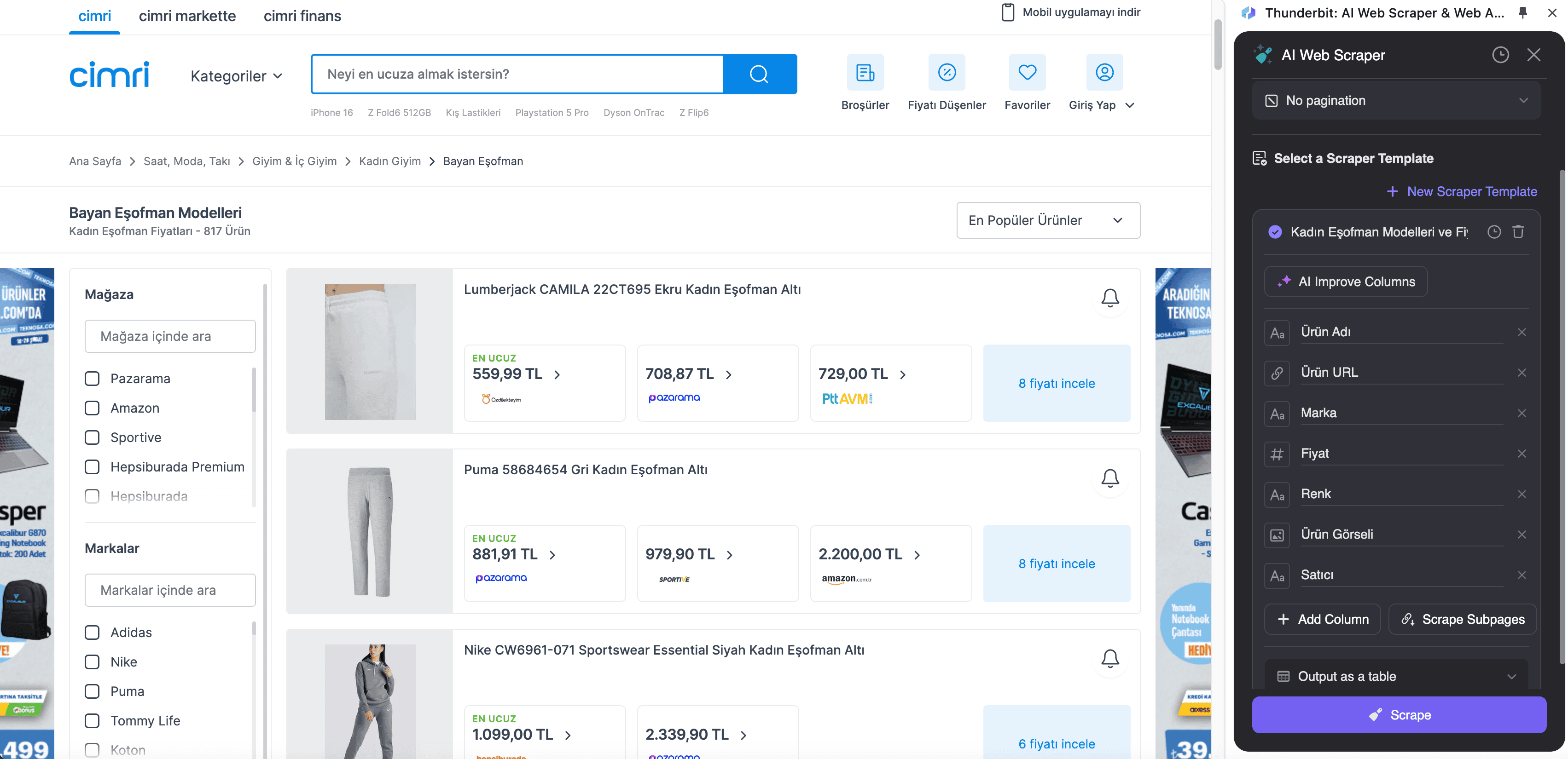 The Cimri Scraper allows you to extract data from product listing pages, such as this page, to gather essential product details.
