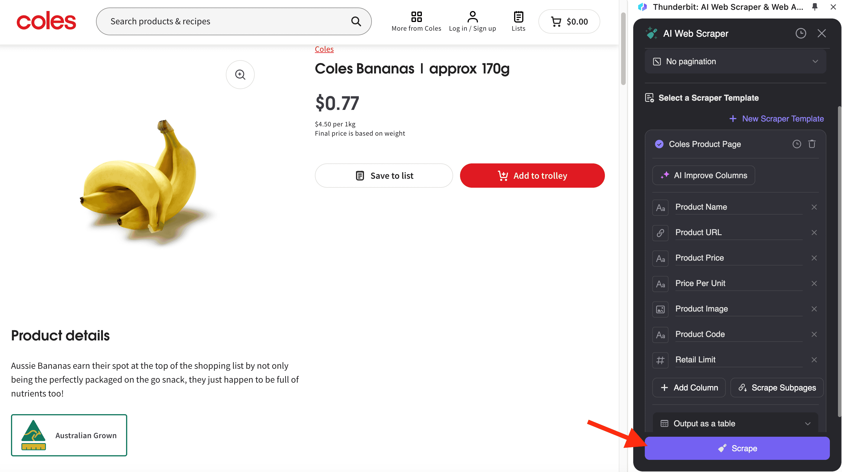 The Coles Scraper also allows you to extract detailed information from individual product pages, such as this SKU page.