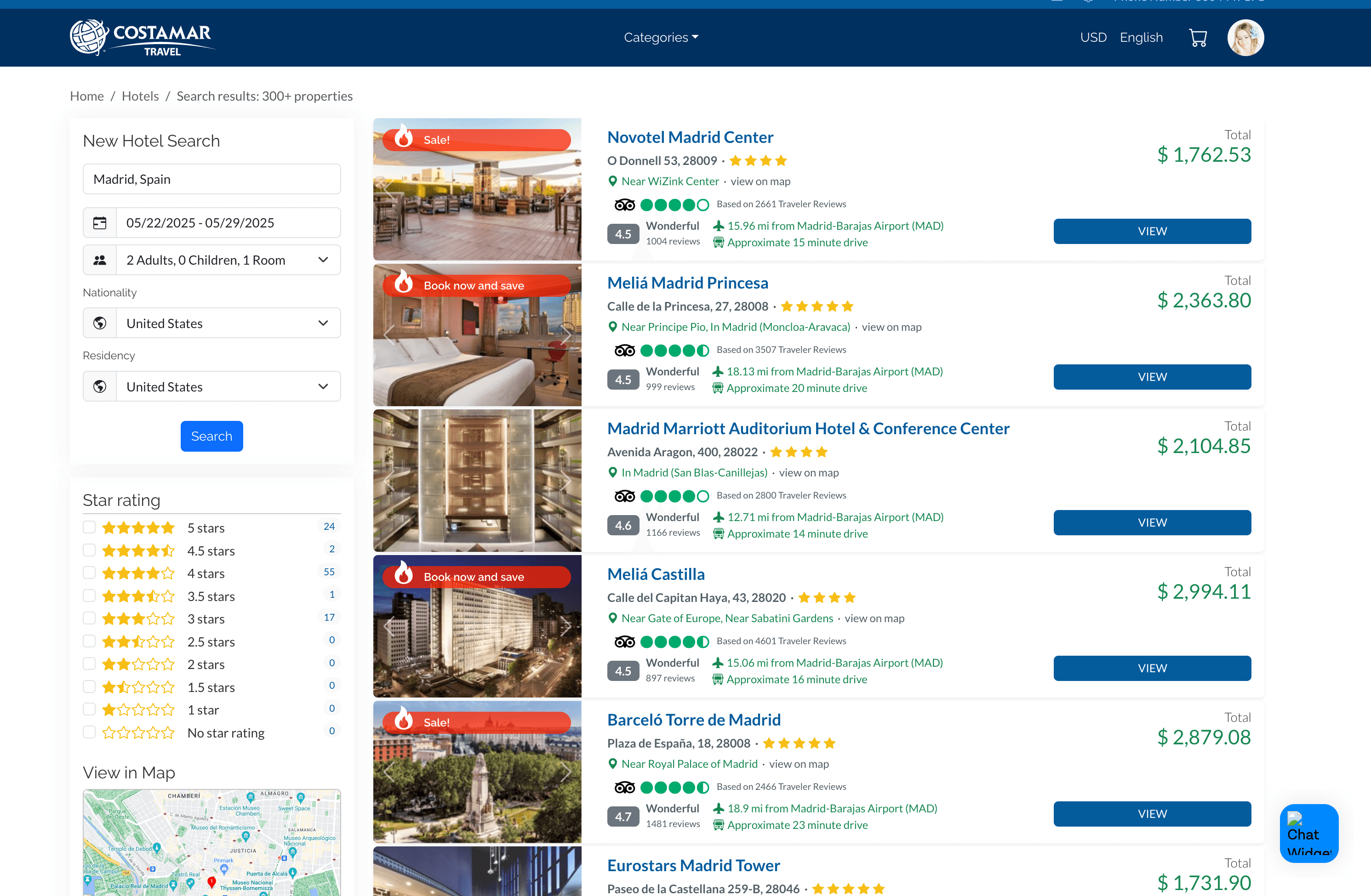 With the Costamar hotel search results page, you can gather a list of hotels, prices, ratings, and more for any destination and date range.