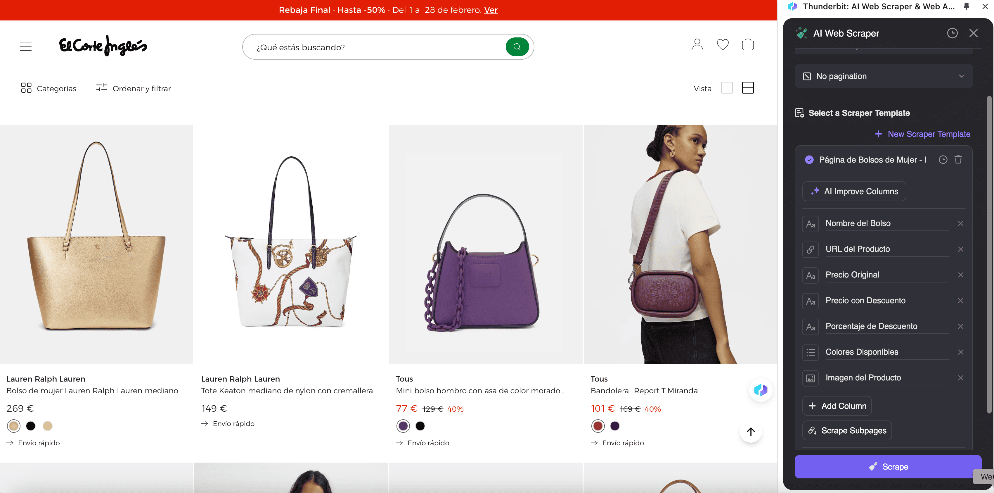 The El Corte Inglés Scraper allows you to extract detailed product information from the Women's Bags product listing page. This is perfect for analyzing product offerings, tracking discounts, or comparing prices.