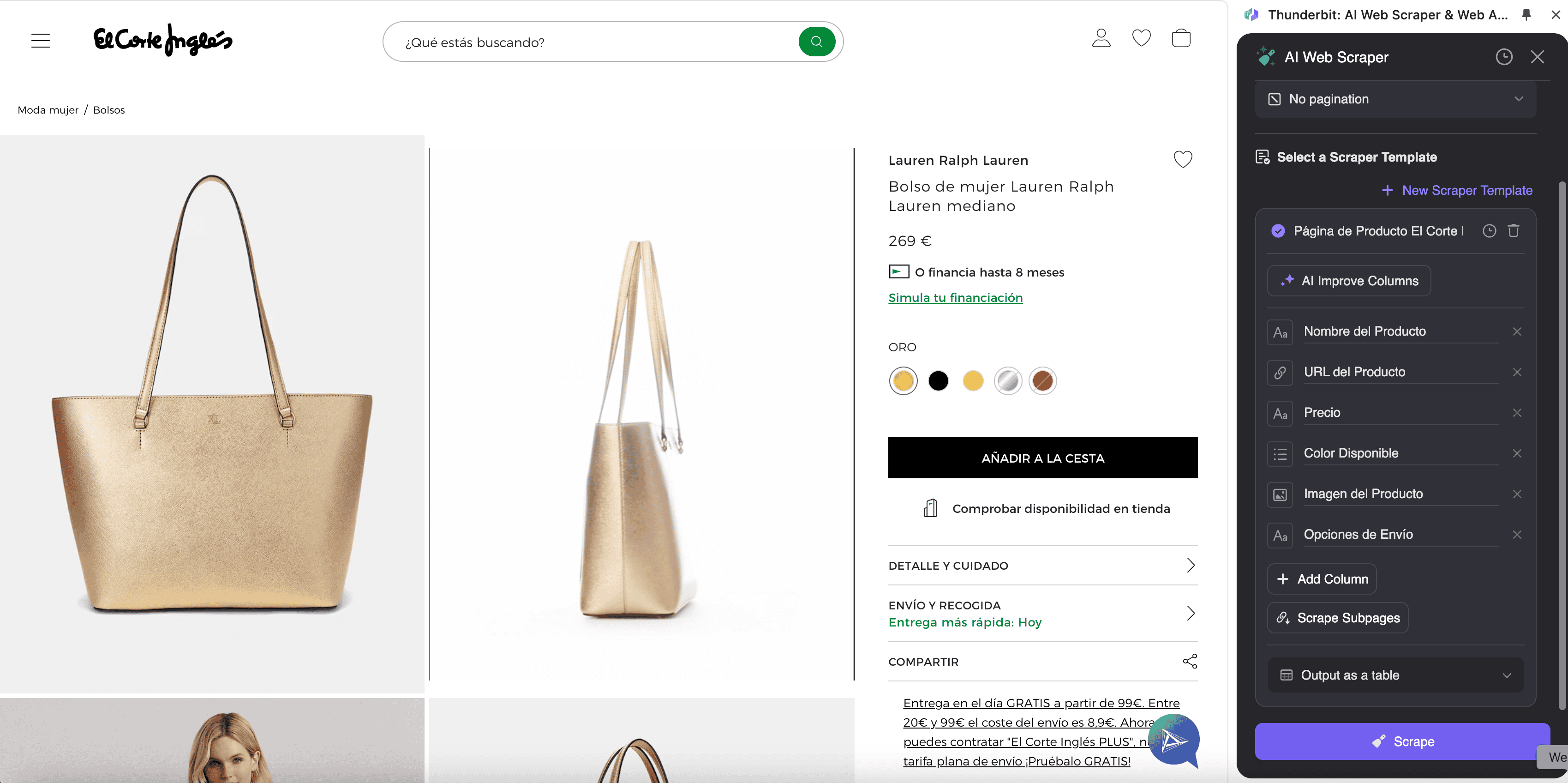 Yes, Scrapebit’s AI-powered scraper can be used to extract data from any category on El Corte Inglés. Simply navigate to the desired page, use the AI Suggest Columns feature, and start scraping.