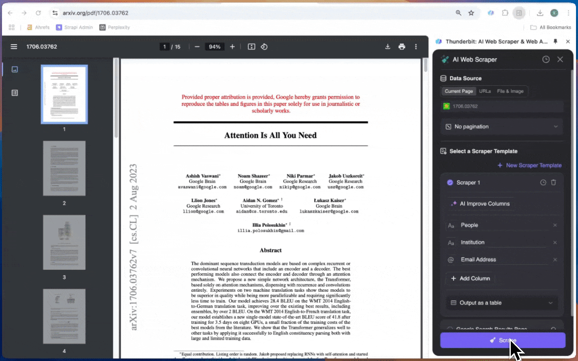 This use case enables you to extract contact details such as names, institutions, and email addresses from PDF documents. For example, you can scrape a research paper on arXiv to gather information about the authors.