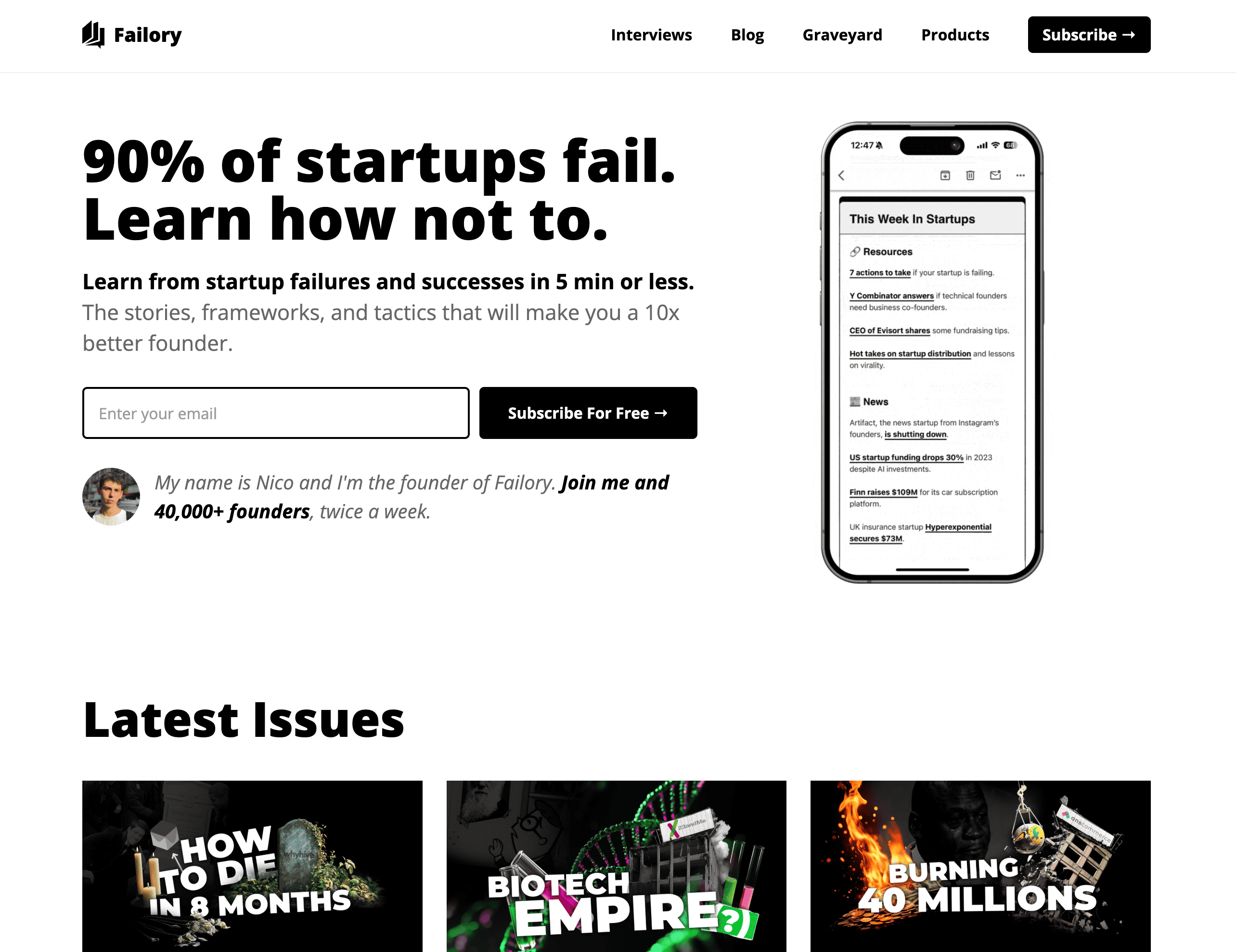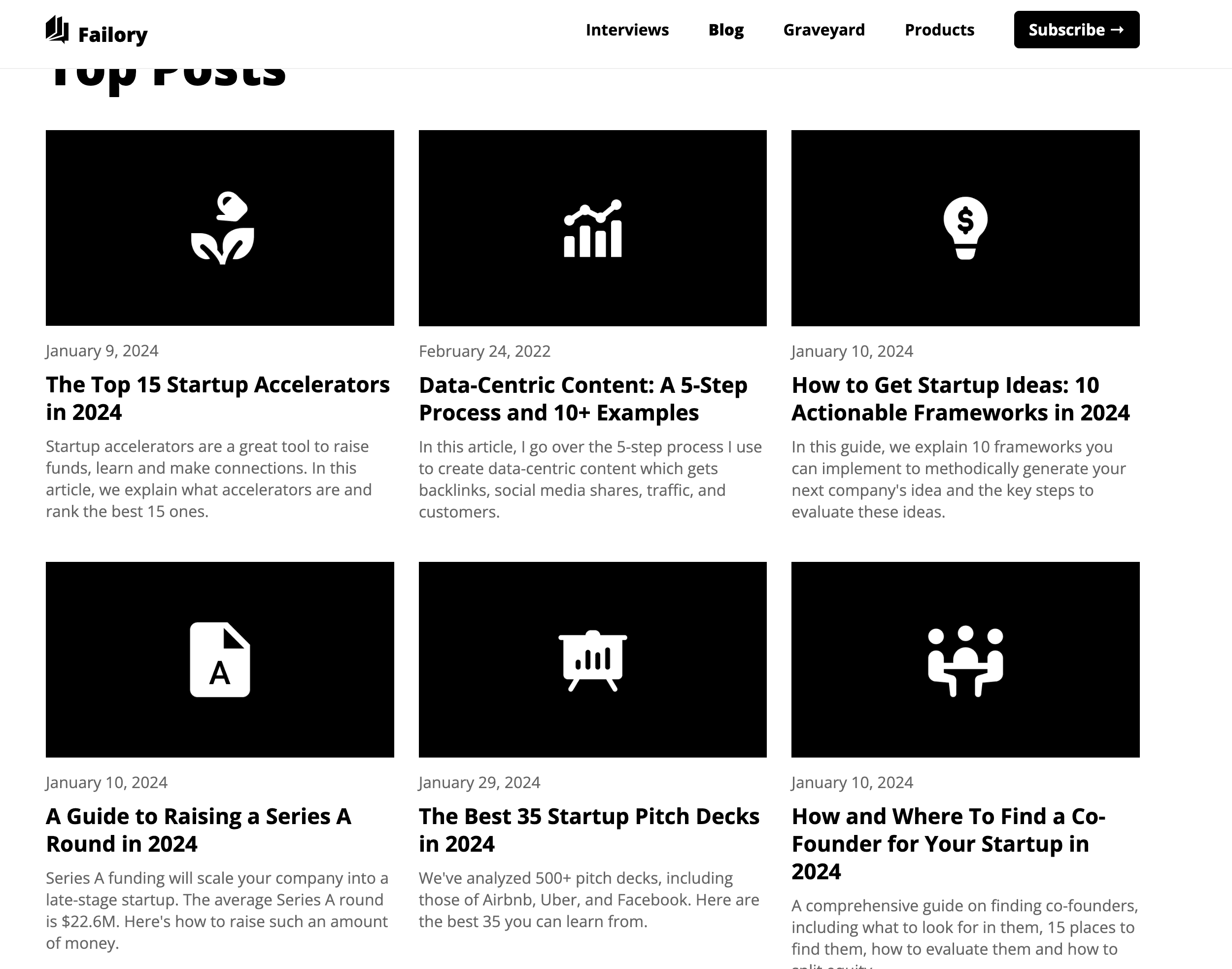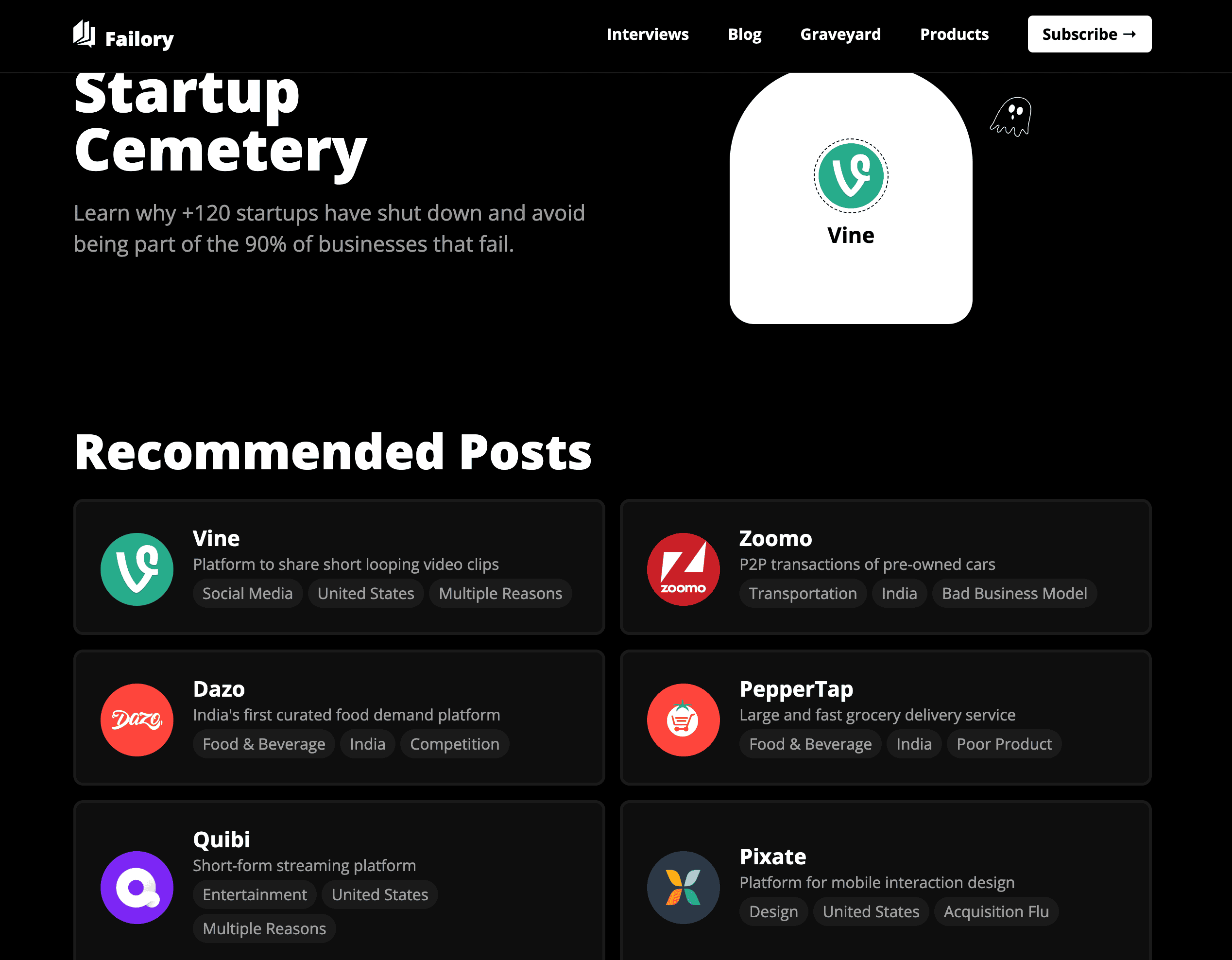 - Navigate to the Startup Cemetery or Blog Page: Go to the Failory page you want to scrape.
