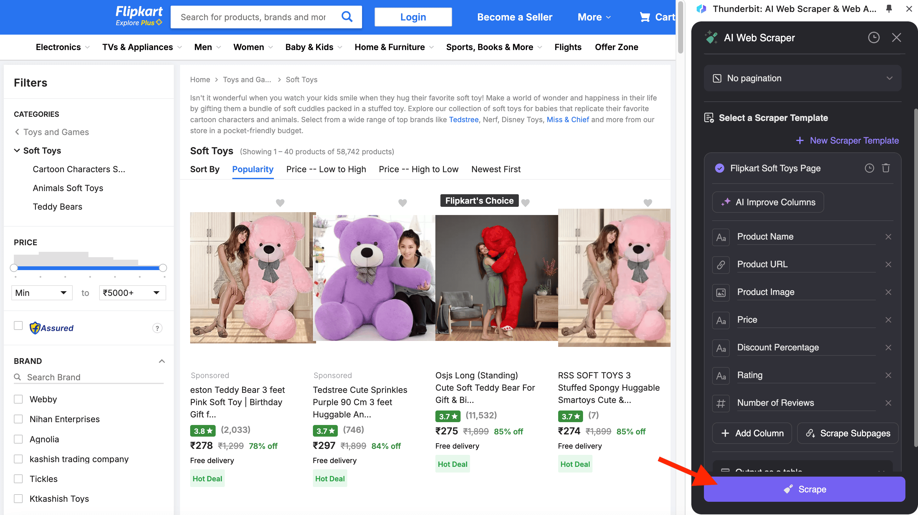 The Flipkart Scraper allows you to extract data from Flipkart's product listing pages. This is perfect for analyzing product categories, comparing prices, or gathering insights for market research.