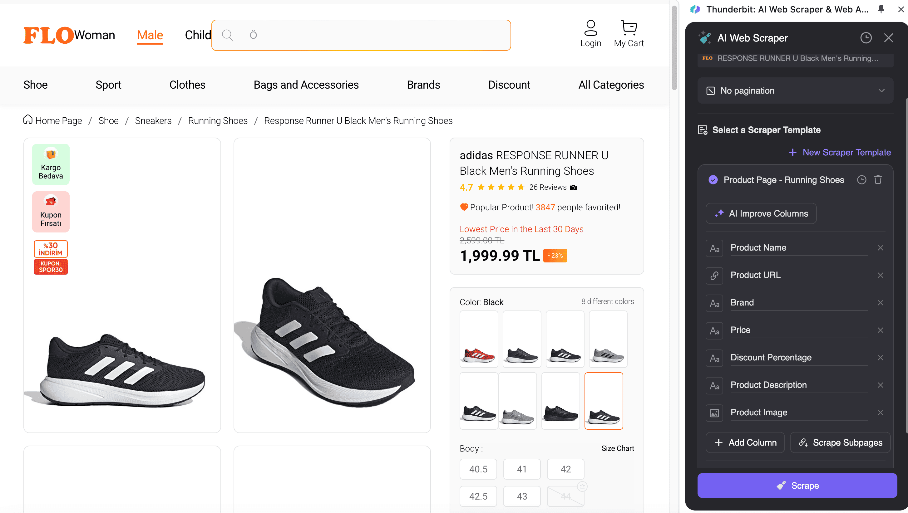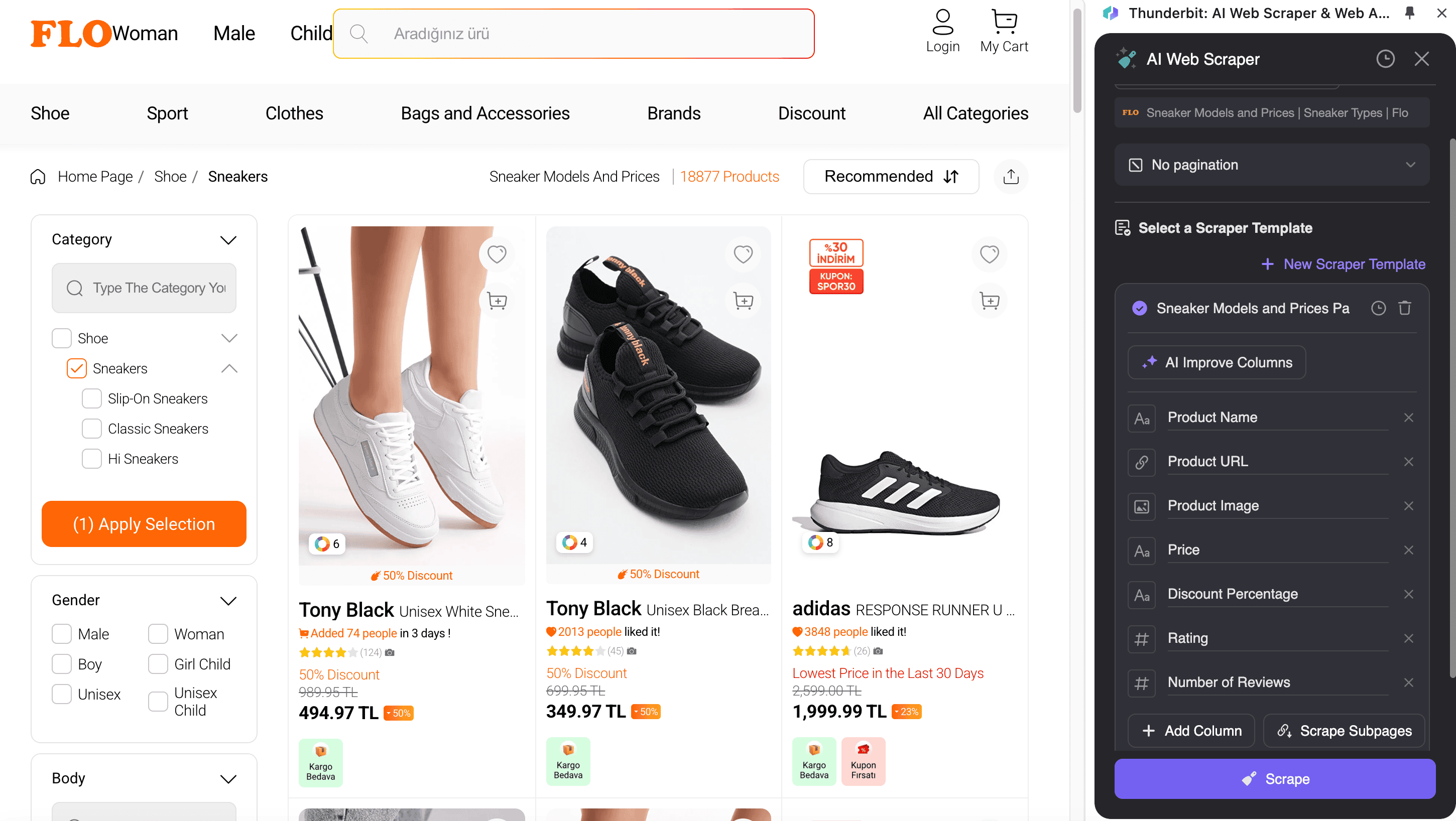 The FLO Product Listing Scraper allows you to extract data from FLO's product listing pages, such as sneakers or other categories.