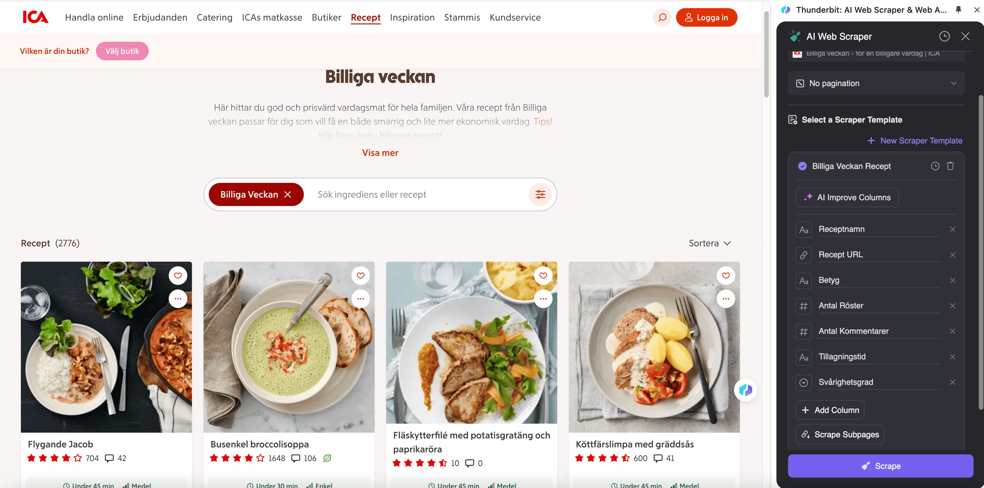 The Scrapebit ICA Scraper lets you extract recipe data from ICA's website, including the Billiga Veckan collection and individual recipe pages. Use AI-powered field suggestions to gather recipe names, images, preparation times, ratings, and more for analysis or meal planning.