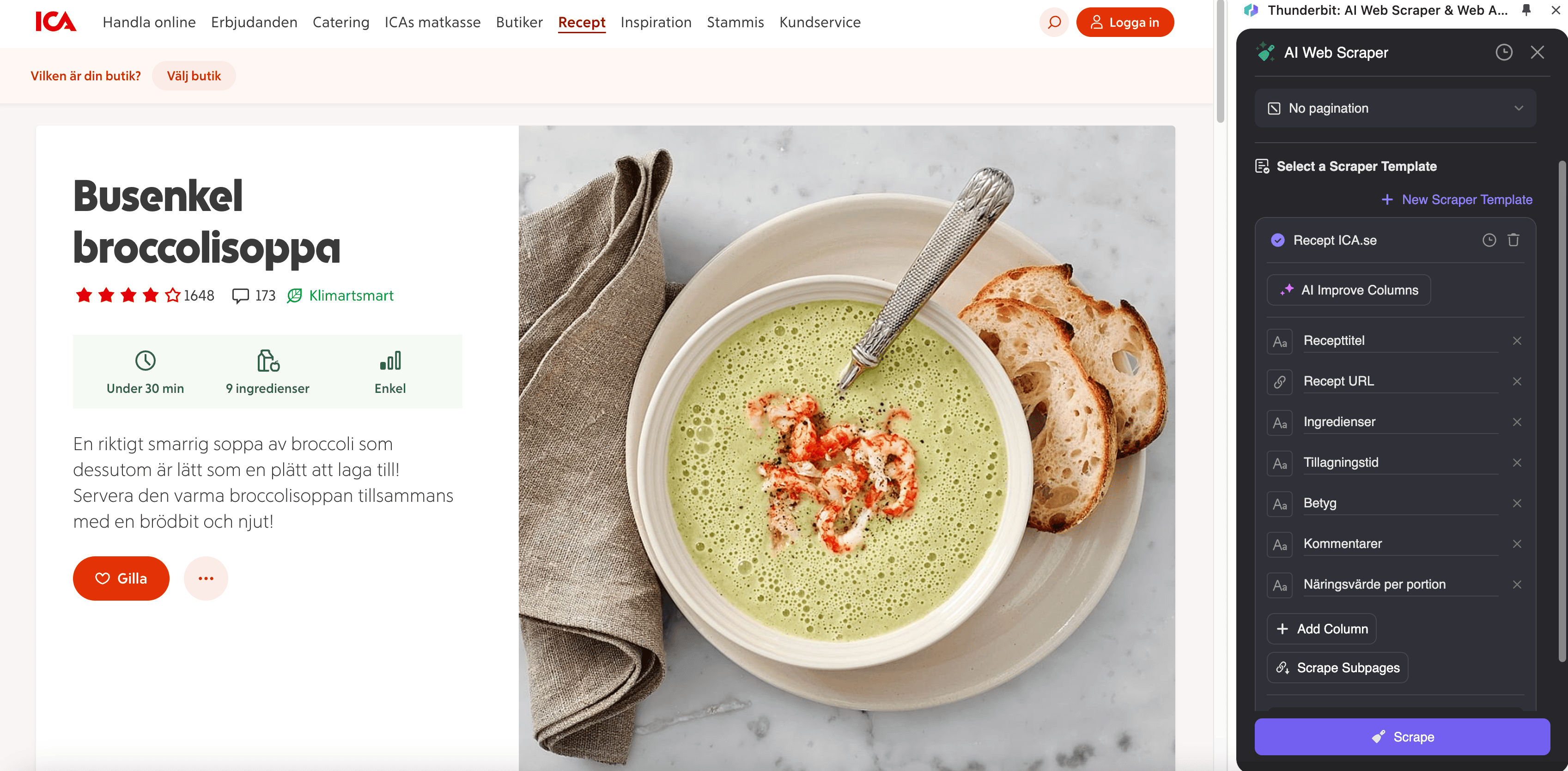 Yes! Scrapebit’s AI-powered scraper is versatile and can be used to extract data from a wide range of recipe websites, not just ICA. Simply navigate to the desired website, use the AI Suggest Columns feature, and start scraping.
