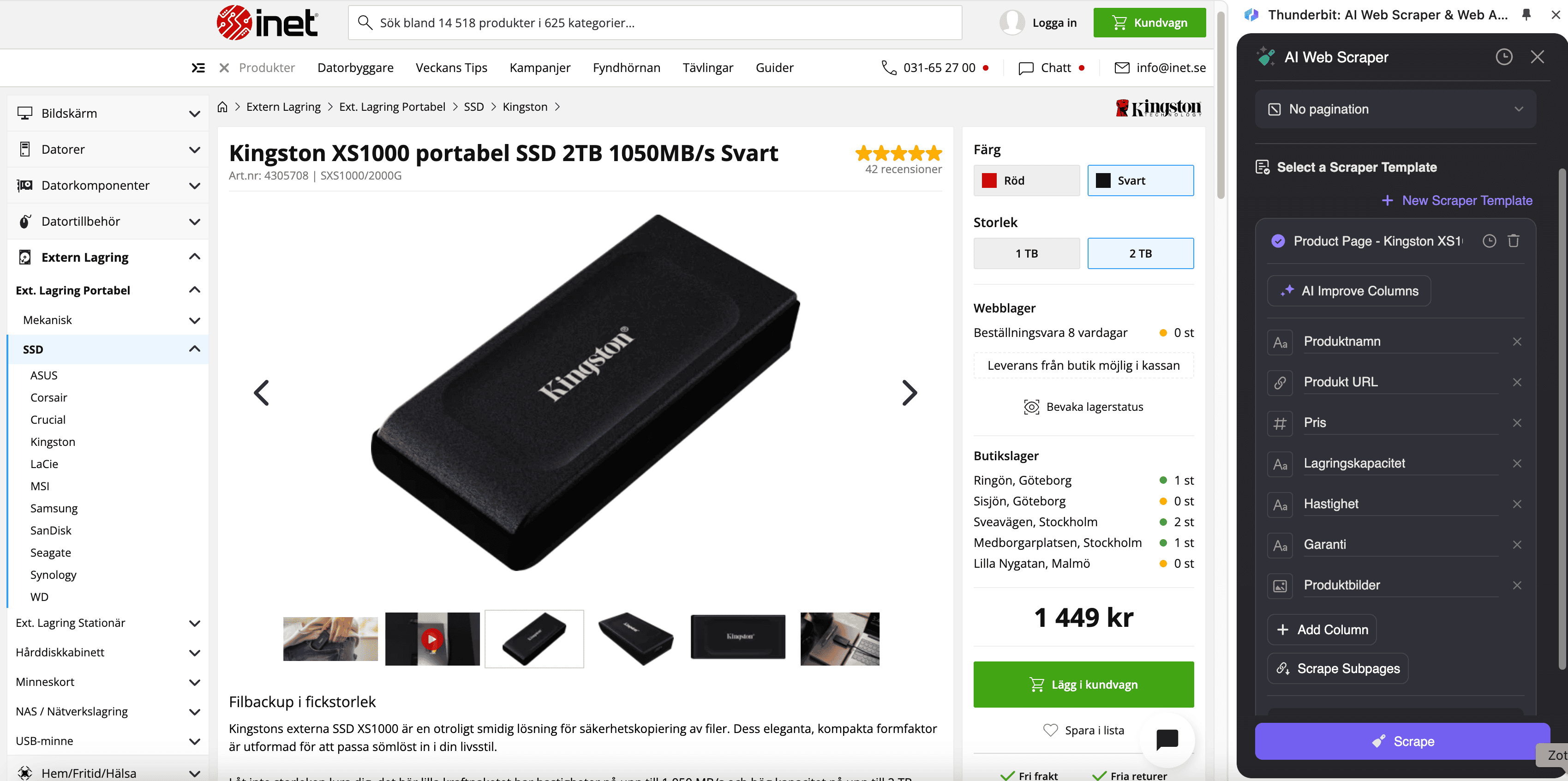 The Inet Scraper also supports scraping detailed SKU information from individual product pages, such as the Kingston XS1000 Portable SSD. This is ideal for professionals who need in-depth product details for analysis or inventory management.