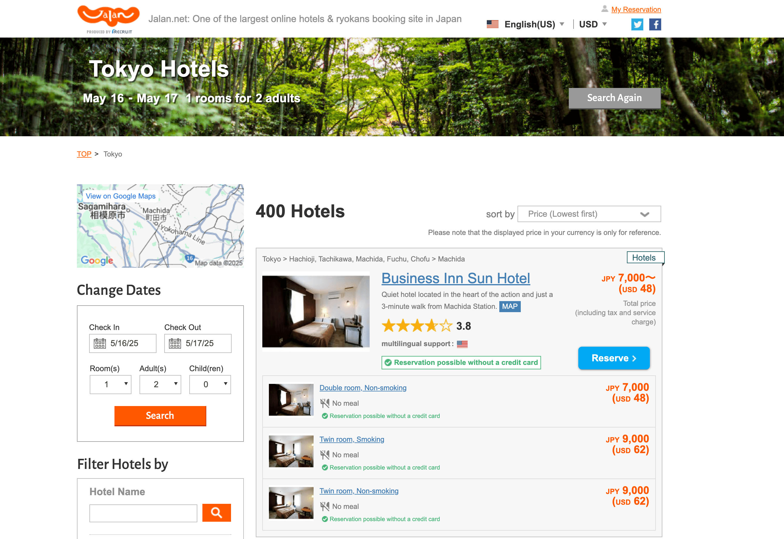 - Go to the destination page, for example: Jalan Hotel Search Result.
