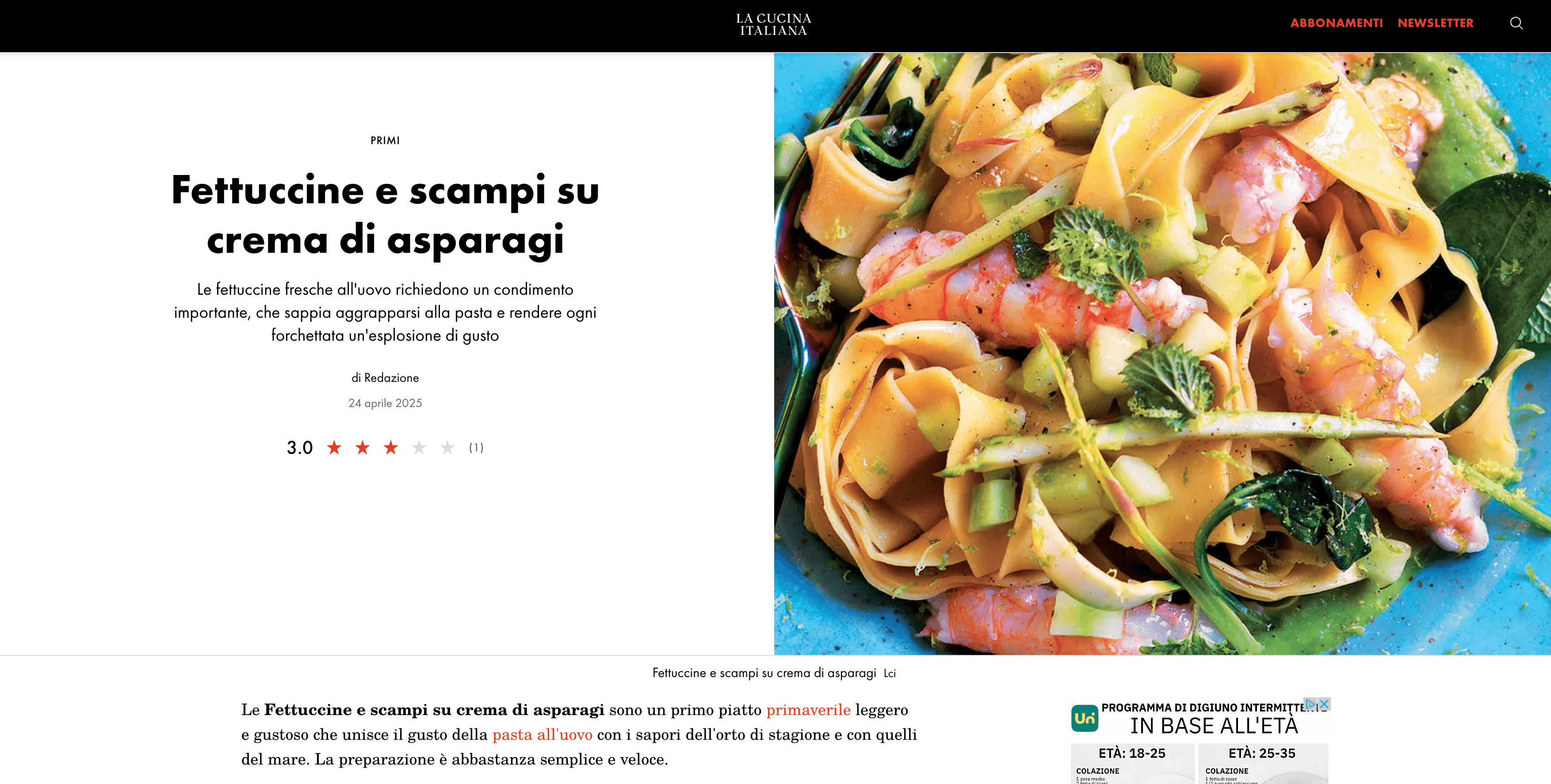 - Navigate to the Recipe Listing or Details Page: Go to La Cucina Italiana Ricette or any specific recipe page, such as Fettuccine e Scampi su Crema di Asparagi.