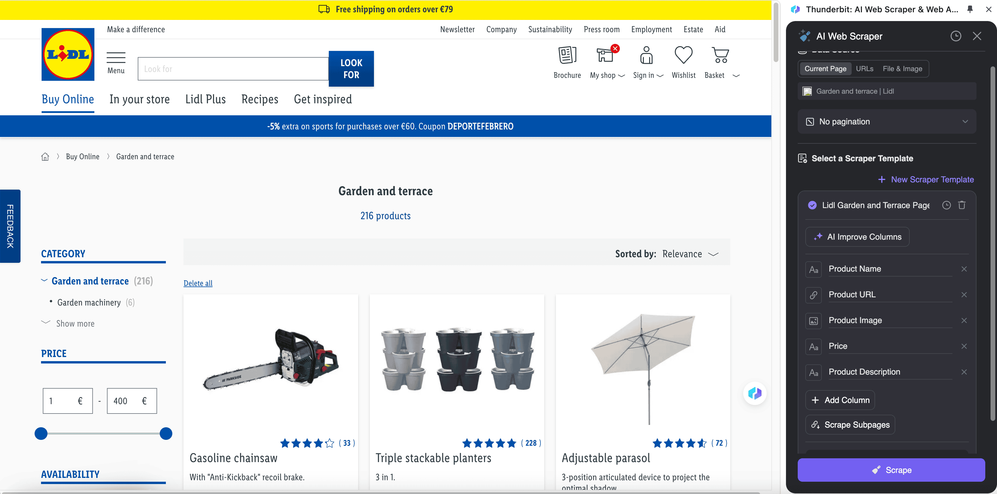 The Scrapebit Lidl Scraper lets you extract detailed product information from Lidl's website, including product listings and SKUs. Use AI-powered field suggestions to quickly gather product names, prices, descriptions, discounts, and material composition for analysis or inventory management.