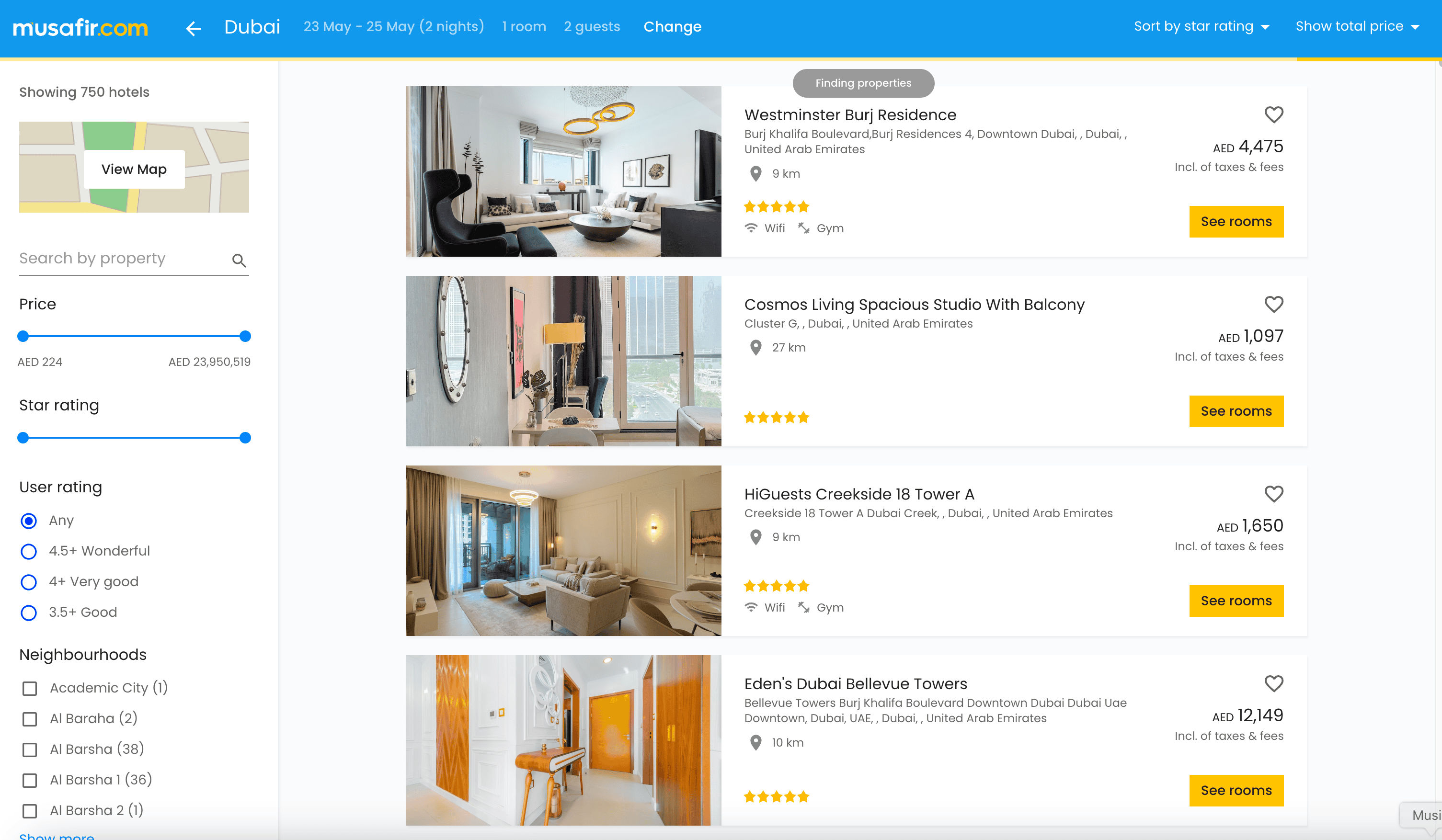 - Go to the Musafir hotel search result page.