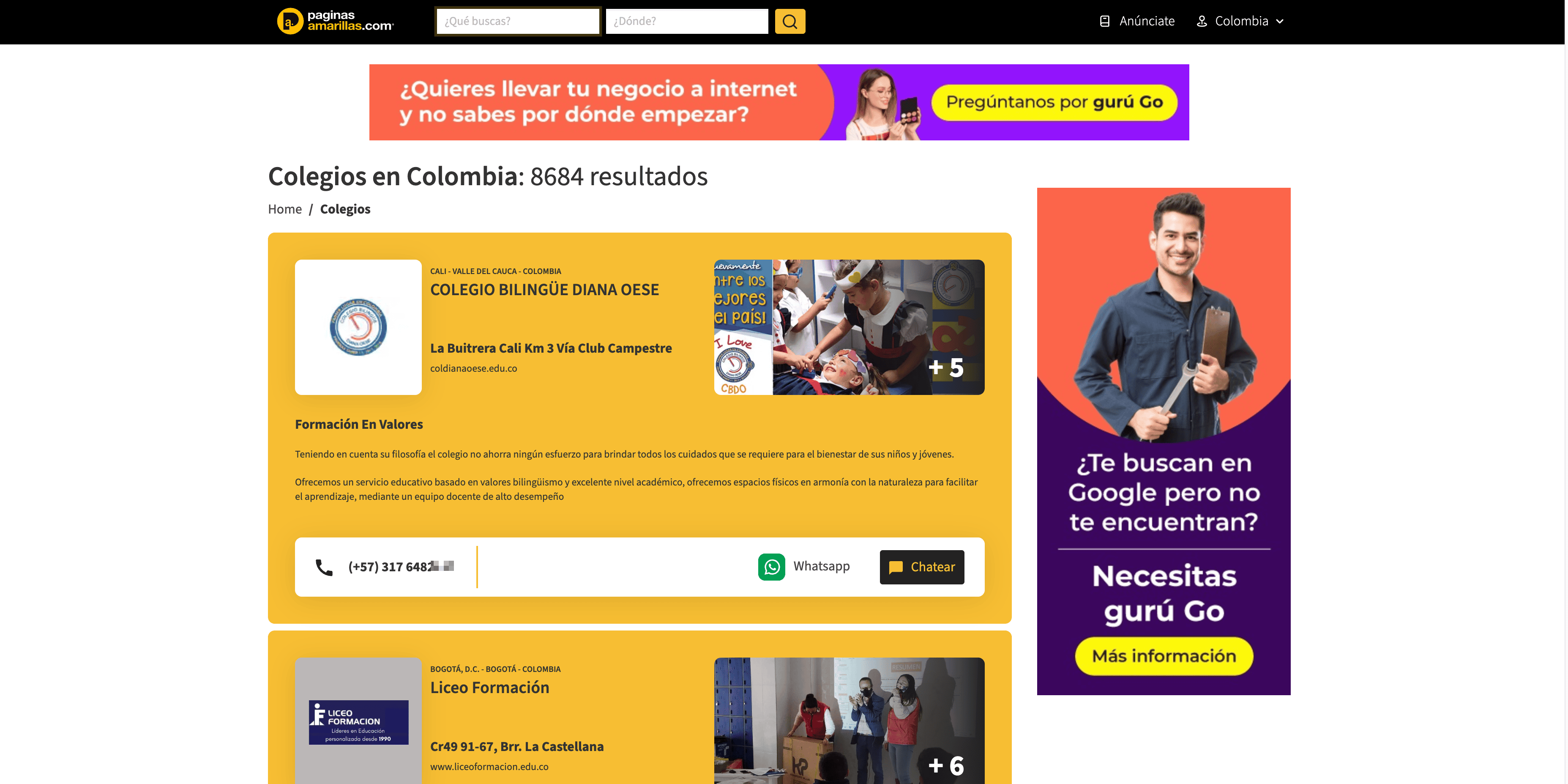 Scrape Páginas Amarillas Colombia School Search Result Page