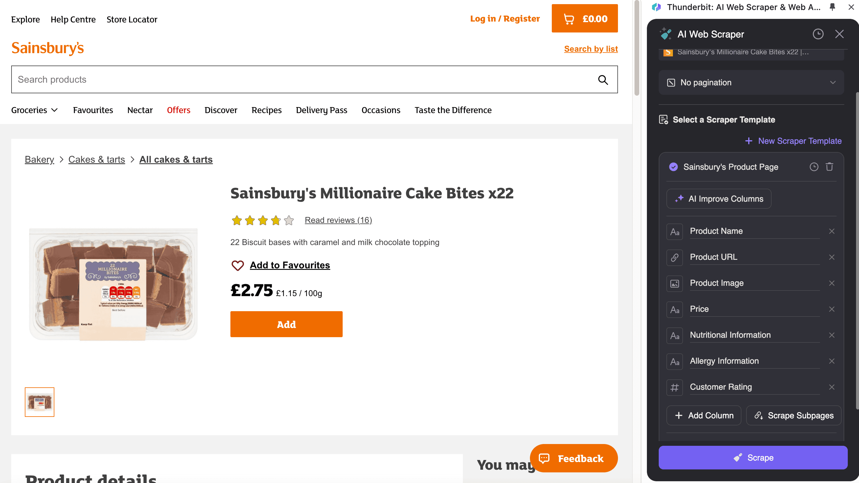 The Sainsbury's SKU Scraper is perfect for extracting detailed information from individual product pages, such as this SKU page for Millionaire Bites.