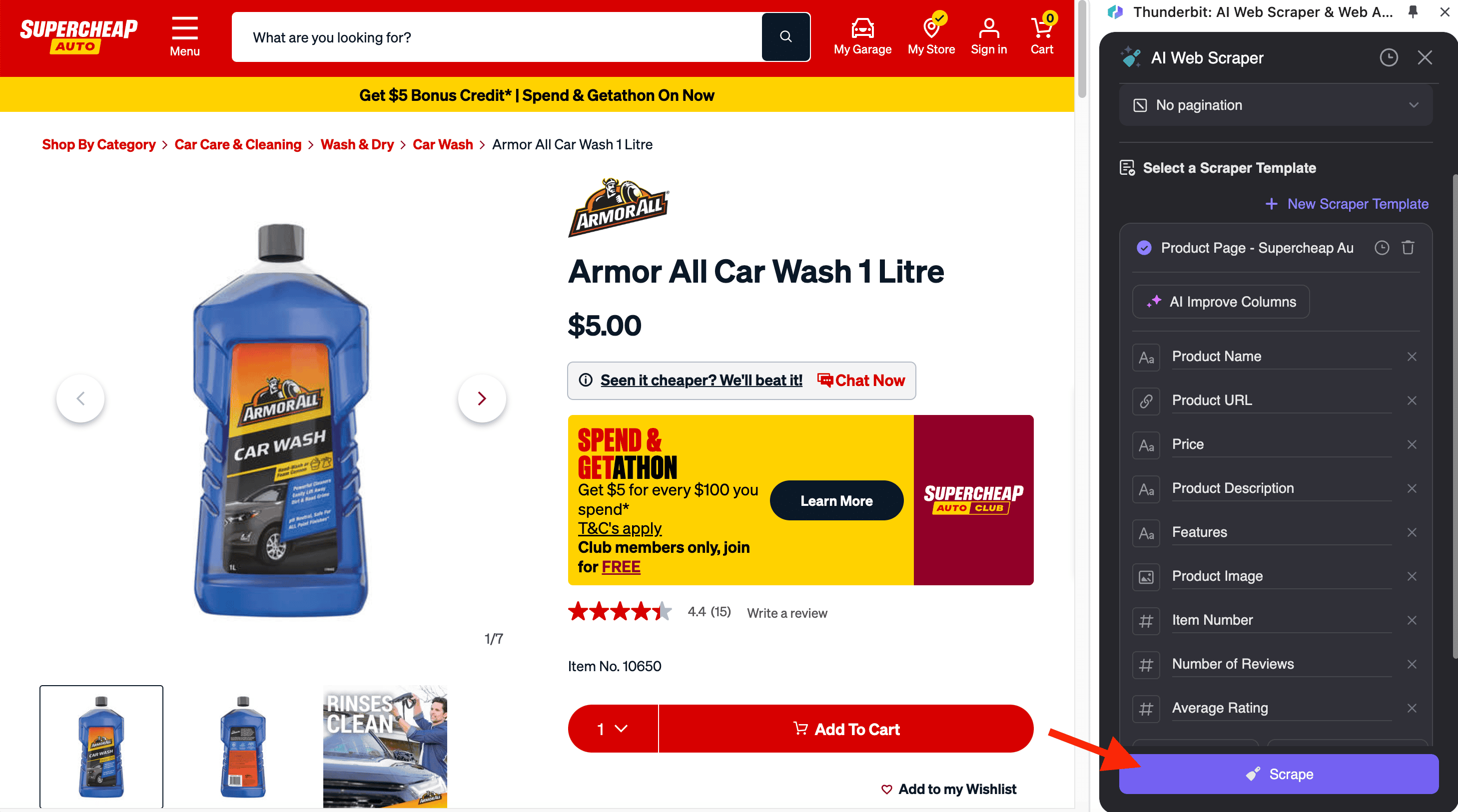 The Supercheap Auto Scraper also supports scraping SKU-specific data from individual product pages, such as the Armor All Car Wash 1 Litre SKU Page. This is ideal for detailed product analysis or inventory management.