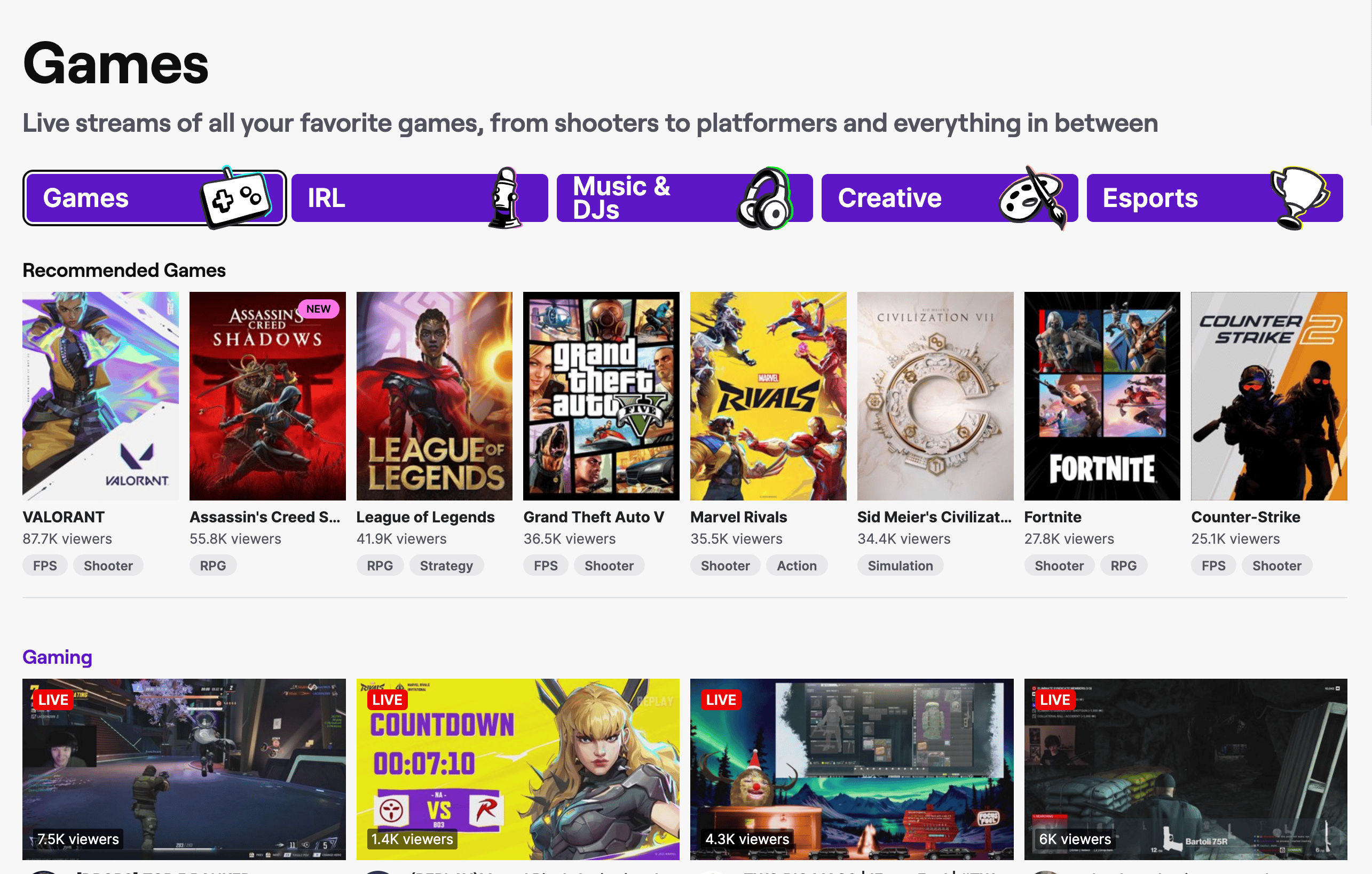 - Navigate to the Games Category or Specific Game Category Page: Go to the Twitch page you want to scrape.