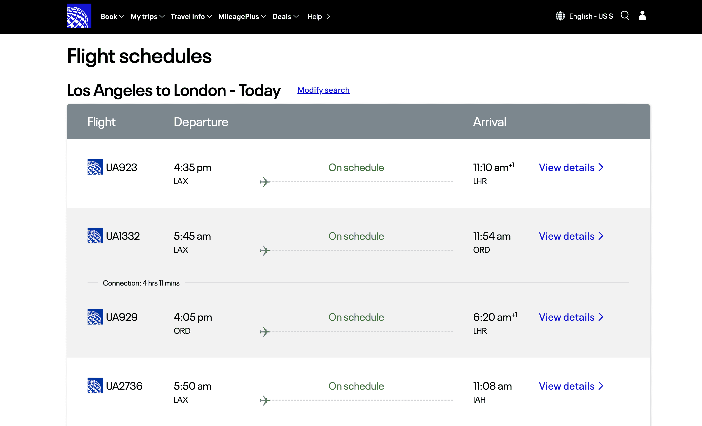 - Go to the destination page, for example: United Airlines Flight Schedule List.