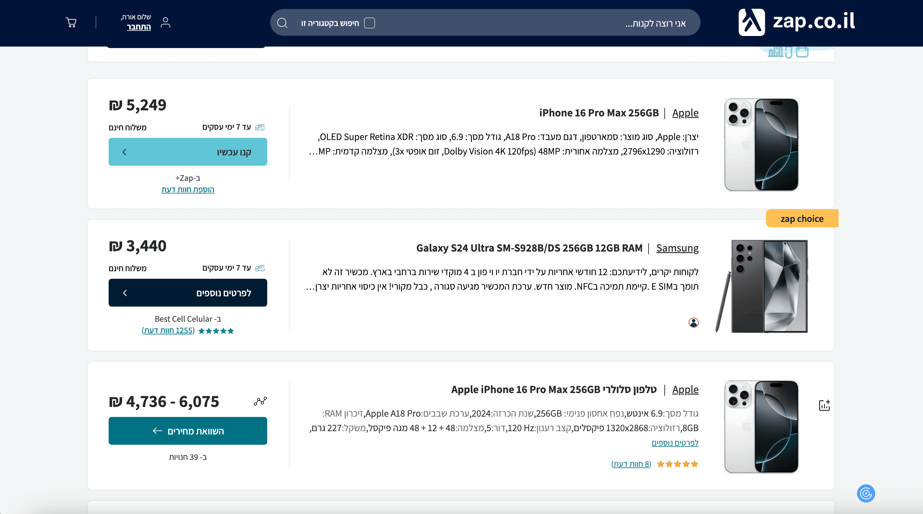 With Scrapebit, you can extract all product listings from a zap.co.il mobile phones category page. This is ideal for building a product database, tracking price changes, or analyzing market trends.